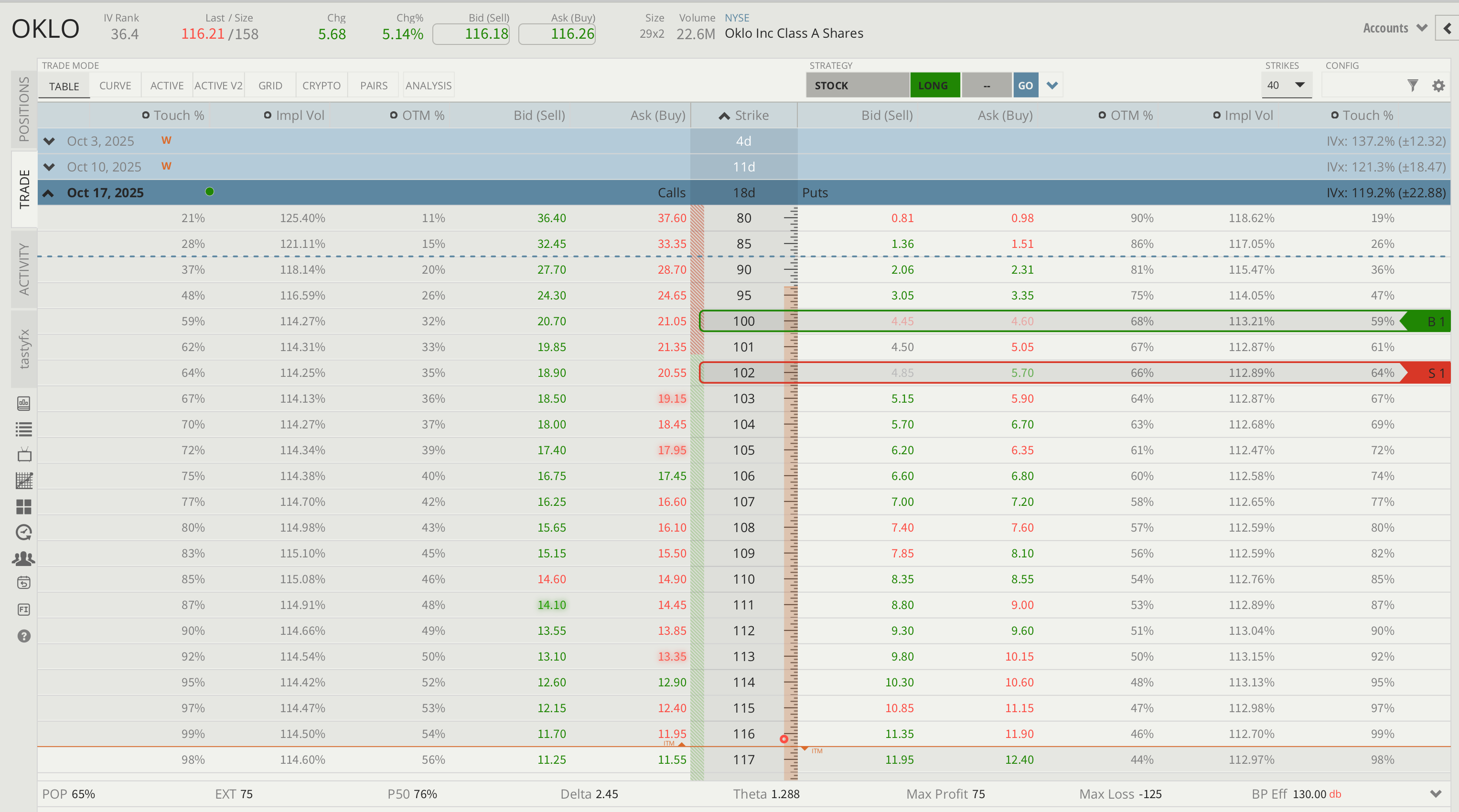 As companies look to expand their AI capacity, the demand for energy to fuel the servers is increasing, too. That’s why small nuclear reactors (SMRs) and the companies that build them are gaining popularity. And OKLO is one of the more ambitious ones. After trading at an all-time high last Wednesday, OKLO fell 23.5% off that high over the next two days. But yesterday it rallied back a bit on news about a partnership with a Swedish SMR company that could expand its business in Europe. And that global interest could keep OKLO moving higher. OKLO’s OTM calls are trading over equidistant OTM puts, indicating that the market sees risk to the upside. That might be enough for a trader to consider a bullish strategy. OKLO’s IV is typically high, and its 119% overall IV and 36% IV rank are high enough to make short premium trades attractive. If you think OLKO will continue to rally back over the next couple of weeks, the short put vertical that’s long the 100 put and short the 102 put in the October expiration with 17 DTE is a bullish strategy that collects a credit 1/3 the width of its strikes, has a 76% prob of making 50% of its max potential profit before expiry, and that generates $1.28 of positive daily theta.