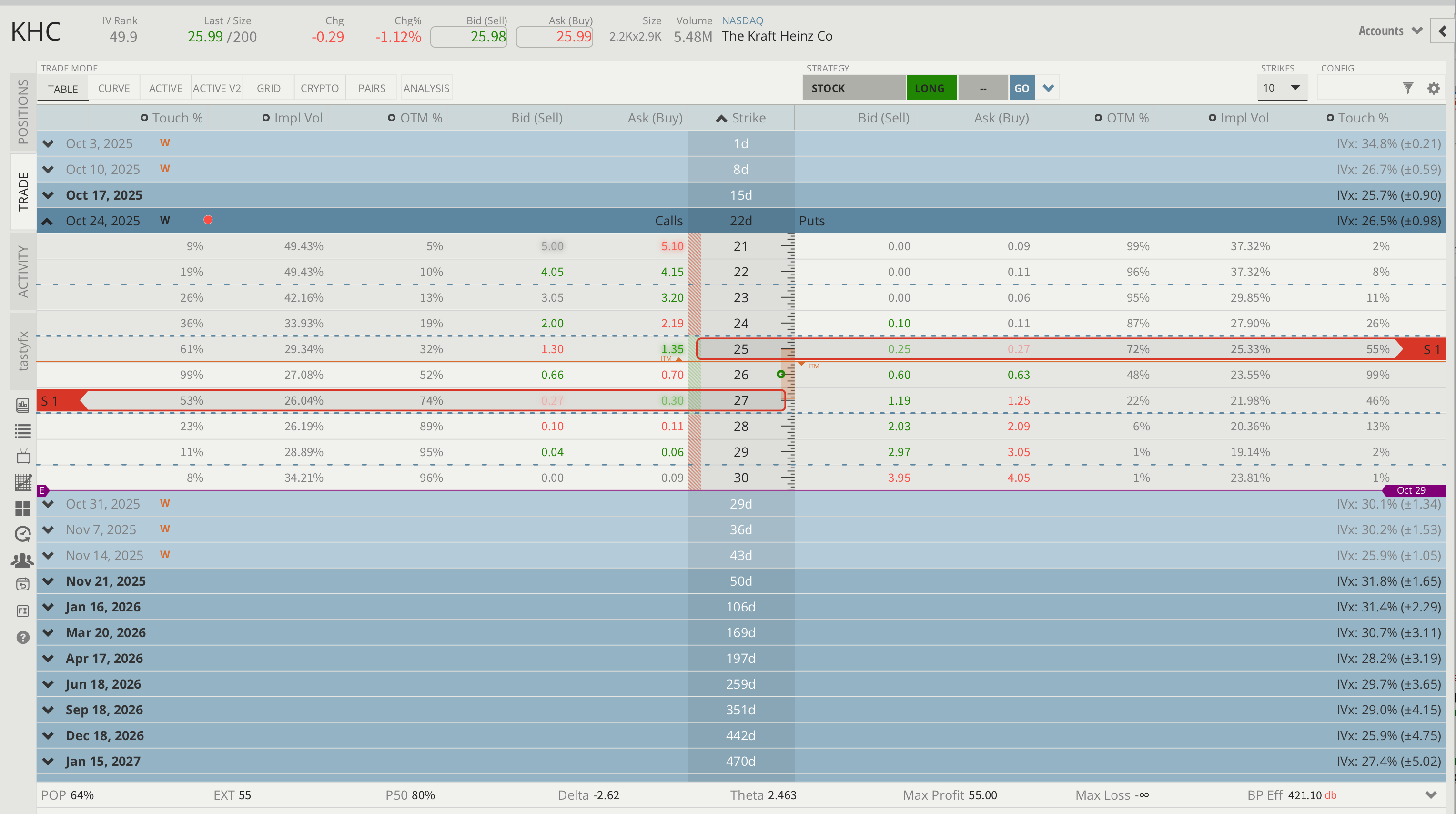 I know, I know, people think I’m the embodiment of “cute”. But in truth, I’m not a big fan of “cute” things, particularly when companies try it. That’s why I just shook my head when Kraft Heinz (KHC) announced last week that it would offer a “Maxwell Apartment” rebrand for a bargain-priced year’s supply of coffee. It’s a nod to the people who rent rather than own their homes. But wouldn’t “Maxwell Pad” sound better? Unfortunately, “cute” didn’t help KHC’s price much. It’s hovering around its lowest price in five years, and has been stuck in a range for the past two months. Its food offerings have fallen out of favor with a health-conscious public, and its plans to split into two companies next year has been met with a “meh”. KHC’s next earnings are coming at the end of October, and the stock might stay in that range until then. That might be enough for a trader to consider a neutral strategy. KHC’s IV has been rising, and its 26% overall IV and 49% IV rank make its options good candidates for short premium trades. If you think KHC might trade in a range for the next couple of weeks and don’t want to take risk through earnings, the short strangle that’s short the 25 put and short the 27 call in the October weekly expiration with 21 DTE is a neutral strategy that has an 80% prob of making 50% of its max potential profit before expiry, and that generates $2.46 of positive daily theta.